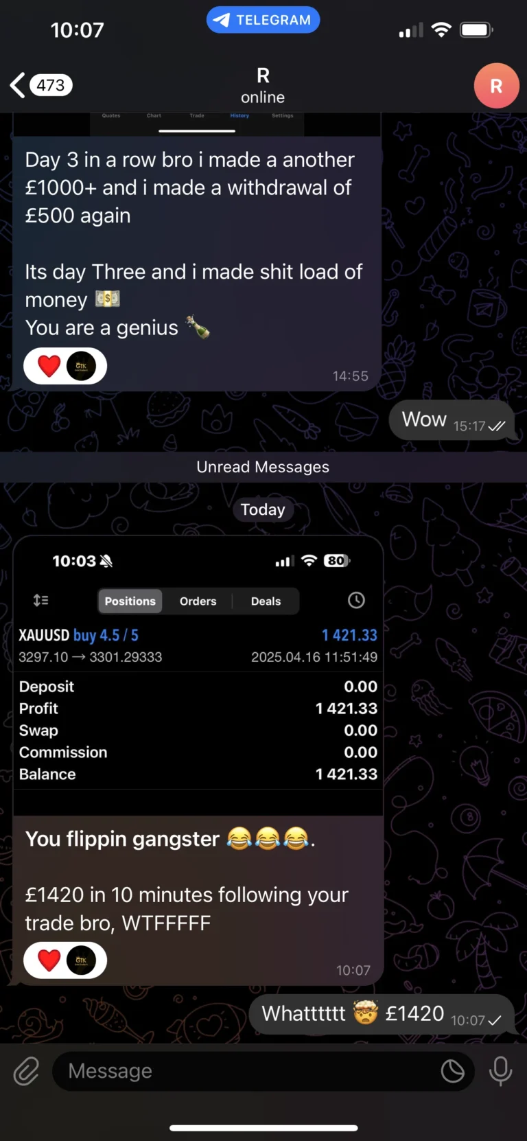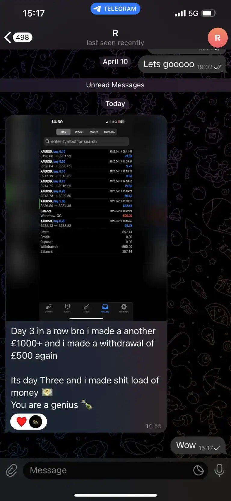 No experience? No problem! You can start making money right away by simply copying my trades live. It’s that easy—just copy, paste, and profit from Day 1. We’ve designed everything so you don’t need any prior knowledge to begin. 95% of our members have never traded before joining us.